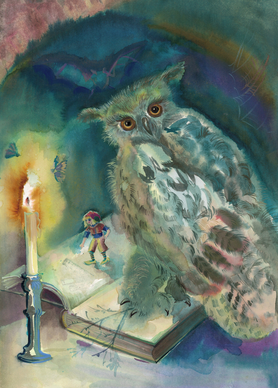 « Nils Holgersson, dans le château Glimmingehus », aquarelle, encre et gouache sur papier, 31,5 × 45,7 cm